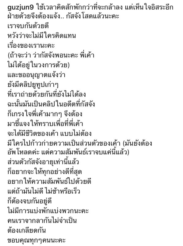 “และขออนุญาตแจ้งว่า ยังมีคลิปยูทูบเก่าๆ ที่เราถ่ายด้วยกันที่ยังไม่ได้ลง ฉะนั้นมันเป็นคลิปในอดีตที่กัสจังก็เกรงใจพี่เค้ามากๆ จึงต้องมาชี้แจงให้ทราบ เพื่อที่พี่เค้าจะได้มีชีวิตของเค้า แบบไม่ต้องมีใครไปก้าวก่ายความเป็นส่วนตัวของเค้า (มันยังต้องอัพโหลดค่ะ แต่ความสัมพันธ์เราจบแค่นี้แล้ว)”