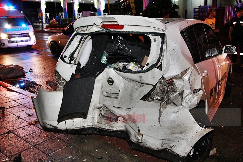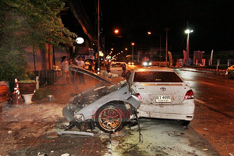 ที่เกิดเหตุเจ้าหน้าที่ตำรวจพบรถเก๋ง ยี่ห้อฮอนด้า สีเทา ทะเบียน จห-5914 กทม. ชนกับเสาไฟส่องสว่างจนทำให้ด้านหน้าห้องเครื่องหลุดและกระเด็นไปถูกรถของประชาชนที่จอดอยู่ริมถนน ประมาณ 5 เมตร เสียหาย 2 คัน คือ รถเก๋ง ยี่ห้อนิสสัน ทะเบียน ฆฬ-2145 กทม. สภาพด้านท้ายยุบเสียหาย ห่างกัน 2 เมตร พบรถเก๋ง ยี่ห้อโตโยต้า วีออส ทะเบียน ฌว-4050 กทม. ท้ายรถถูกหัวรถเก๋งที่ขาดกระเด็นมาโดนเสียหายเช่น