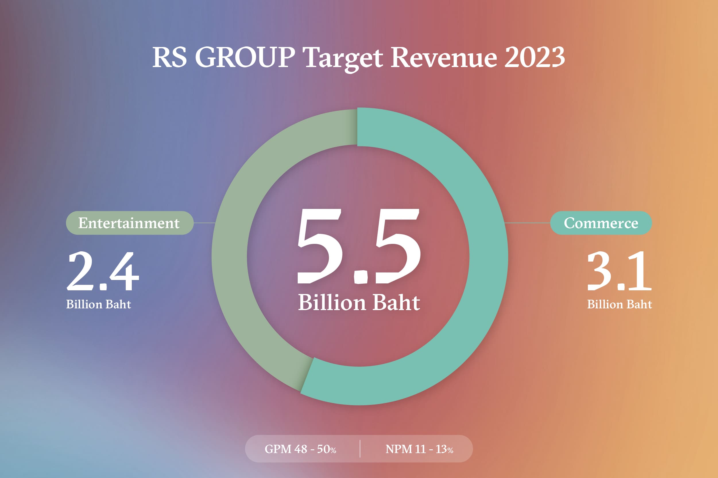 นอกจากฝั่งอีคอมเมิร์ซและคอนเทนต์ อาร์เอสกรุ๊ปมีส่วนของการทุนก็คือ R Alliance สำหรับการทำ M&A และ JV โดยปีนี้คาดว่าจะมีการลงทุนในปีนี้2-3 ดีล ภายใต้งบลงทุนไม่เกิน 600 ล้านบาท นอกจากนี้ บริษัทได้มีการตั้งสายงานใหม่ Media Sell and Marketing ดูแลการซื้อสื่อและการทำการตลาดแบบ one stop service ครอบคลุมและเชื่อมโยงสื่อและบันเทิงในทุกธุรกิจของอาร์เอส กรุ๊ป ช่วยให้การซื้อสื่อโฆษณาและการทำการตลาดของลูกค้ามีประสิทธิภาพและคุ้มค่ามากที่สุด สำหรับรายได้ของปี 2023 บริษัทตั้งเป้าไว้ที่ 5,500 ล้านบาท โดยมาจาก ธุรกิจคอมเมิร์ซ 3,100 ล้านบาท (RS LiveWell 1,800 ล้านบาท, RS Connect 900 ล้านบาท และ RS Pet All 400 ล้านบาท) และ ธุรกิจมีเดียและเอ็นเตอร์เทนเมนต์ 2,400 ล้านบาท (RS Multimedia 1,450 ล้านบาท, RS Music 400 ล้านบาท และอีเวนต์-คอนเสิร์ต 550 ล้าบาท) และในช่วง 3 ปีจากนี้ต้องการให้ภาพรวมทั้งหมดเติบโตปีละ 30-40%