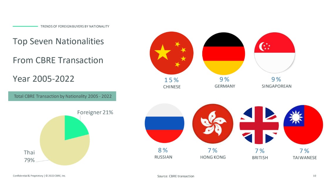 ด้าน “อาทิตยา เกษมลาวัณย์” หัวหน้าแผนกซื้อขายโครงการที่พักอาศัย บริษัท ซีบีอาร์อี (ประเทศไทย) จำกัด เปิดเผยถึงข้อมูลของ CBRE ที่เก็บสะสมระหว่างปี 2548-2565 พบว่าสัญชาติที่เข้าซื้ออสังหาฯ ในเมืองไทยมากที่สุดคือ 1.จีนแผ่นดินใหญ่ 2.เยอรมัน 3.สิงคโปร์ 4.รัสเซีย 5.ฮ่องกง 6.อังกฤษ และ 7.ไต้หวัน (*CBRE เป็นตัวแทนขายอสังหาฯ ระดับลักชัวรีจนถึงซูเปอร์ลักชัวรีเป็นหลัก ทำให้ข้อมูลอาจแตกต่างจากการเก็บข้อมูลอสังหาฯ รวมทุกระดับราคา)