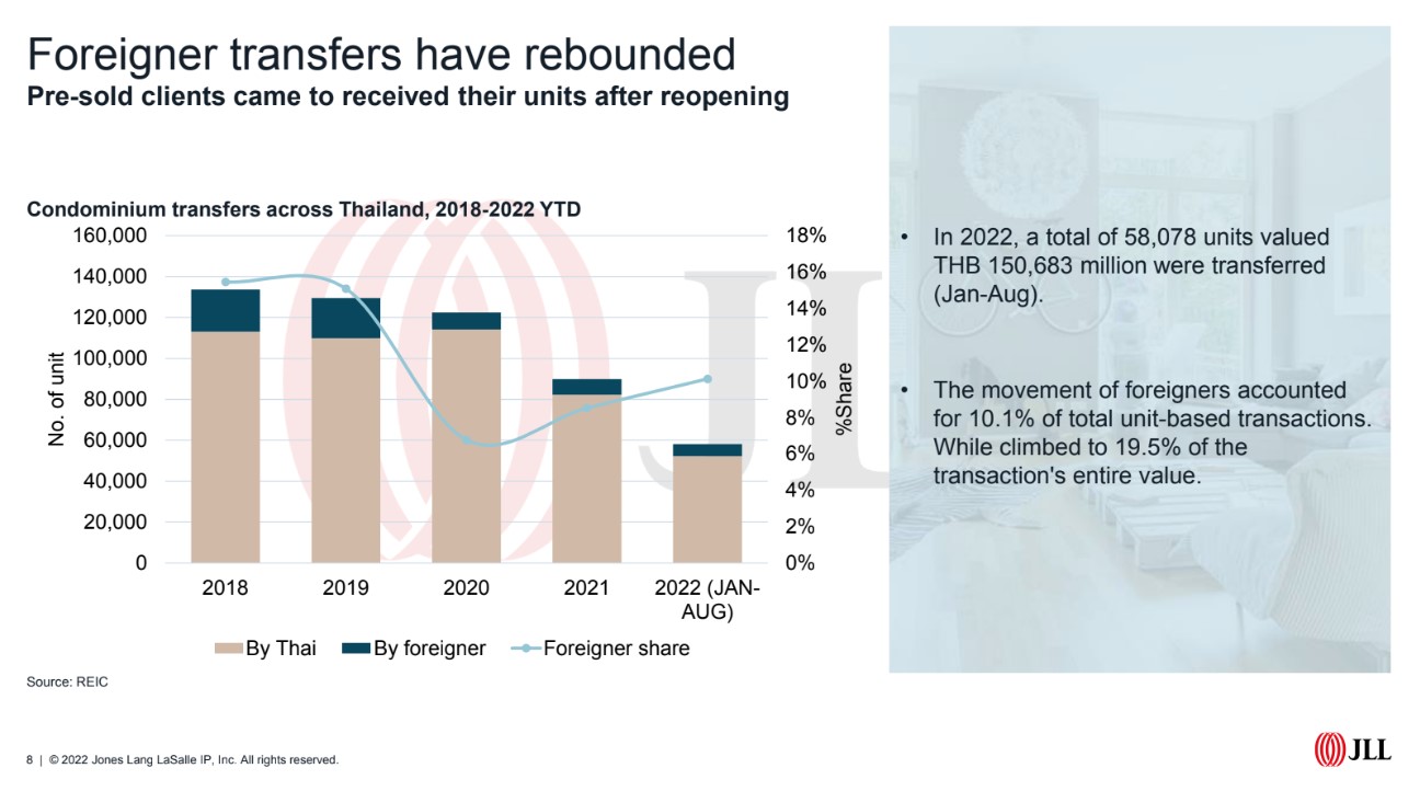 ข้อมูลจาก JLL ระบุ ปี 2565 การเข้าซื้อคอนโดฯ เมืองไทยของ “ต่างชาติ” เริ่มกลับมาฟื้นตัว โดยคิดเป็น 10.1% ของยูนิตขายทั้งหมด