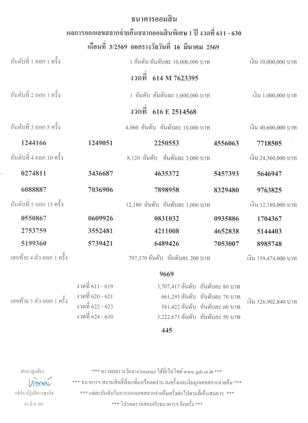 วันที่ 16 มีนาคม 2569 ธนาคารออมสิน เผยแพร่ ผลสลากออมสิน พิเศษ 1 ปี งวดที่ 611-630 เดือนที่ 3/2569 ออกรางวัลวันที่ 16 มีนาคม 2569 ระบุว่า