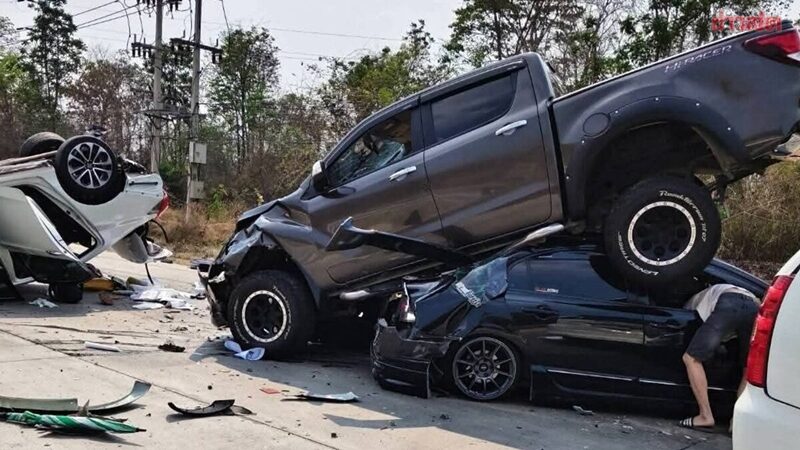 เกิดเหตุรถพ่วง 18 ล้อขับชนรถบนท้องถนนพังยับ 7 คันรวด ส่งผลมีผู้เสียชีวิตในที่เกิดเหตุ 2 คน เป็นชาย 1 ราย และหญิง 1 ราย ซึ่งติดอยู่ภายในรถเก๋งที่ถูกรถบรรทุกชนอัดและลากออกไปข้างทาง