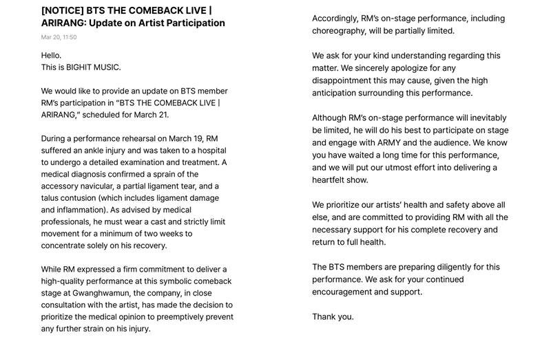 ล่าสุดวันที่ 20 มี.ค.2569 BIGHIT MUSIC ต้นสังกัดของวง BTS ได้ออกแถลงการณ์อย่างเป็นทางการระบุว่า “สวัสดีครับ/ค่ะ นี่คือ BIGHIT MUSIC เราขอแจ้งอัพเดตเกี่ยวกับการเข้าร่วมงาน “BTS THE COMEBACK LIVE | ARIRANG” ของ RM ซึ่งมีกำหนดจัดขึ้นในวันที่ 21 มีนาคมนี้ ทั้งนี้ระหว่างการซ้อมการแสดงเมื่อวันที่ 19 มีนาคม RM ได้รับบาดเจ็บที่ข้อเท้า และถูกนำตัวส่งโรงพยาบาลเพื่อตรวจอย่างละเอียดและรับการรักษา