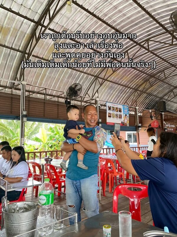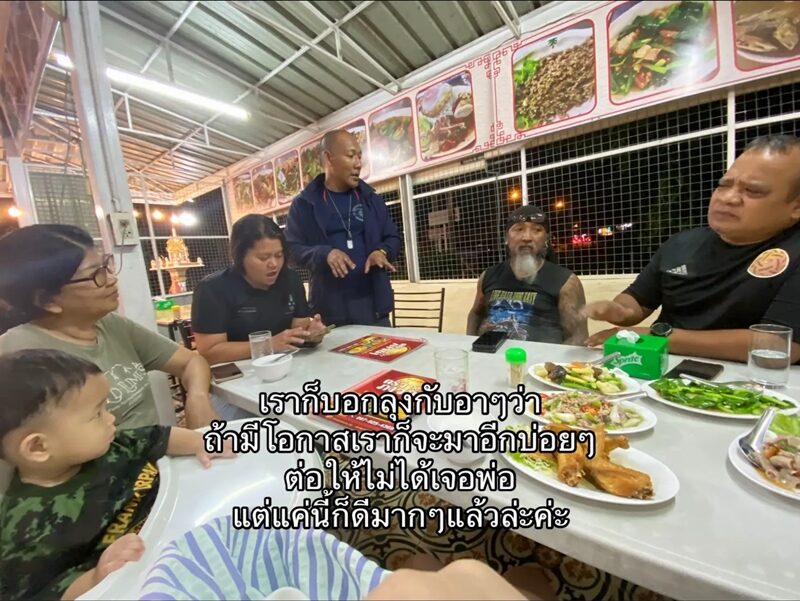 แต่ก็ไม่ได้มีโอกาสได้ไปเจอกันจริงๆ สักที จนเราอายุ 31 มีลูกแล้ว ลุงก็เกษียณแล้ว เราก็กลัวว่าจะไม่มีโอกาสได้เจอกัน เพราะเราต่างก็แก่ตัวกันไปเรื่อยๆ เลยตัดสินใจไปเจอ มันอบอุ่นมากๆๆๆๆๆ ทุกคนต้อนรับดีมาก อาคือเดินเข้ามากอด น้ำตาจะไหล ต่อให้เราไม่เจอพ่อ แต่ทุกคนก็ยังรักและเอ็นดูเรามากๆ