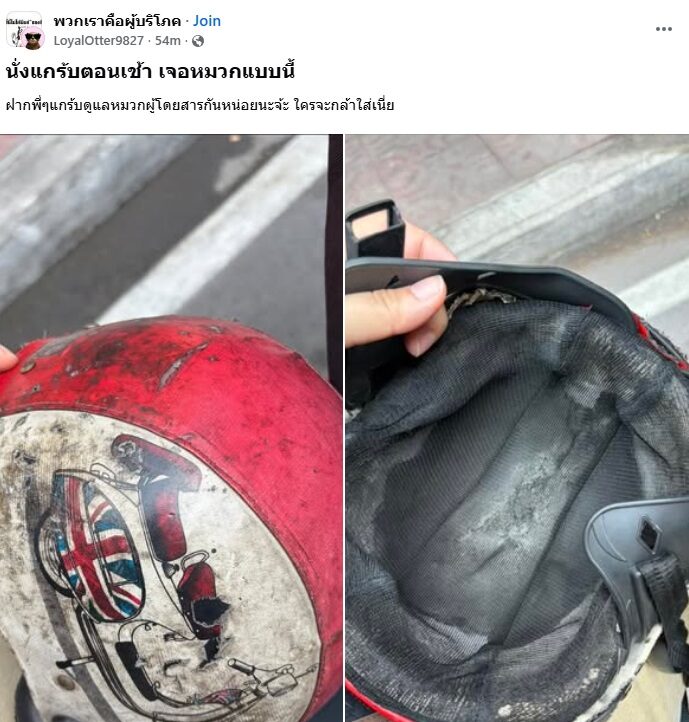 ผู้ใช้เฟซบุ๊กรายหนึ่ง โพสต์ภาพสภาพหมวกกันน็อก ที่ได้รับจากไรเดอร์รายหนึ่ง ลงในกลุ่ม พวกเราคือผู้บริโภคพร้อมเขียนข้อความ ระบุว่านั่งรถแอปตอนเช้า เจอหมวกแบบนี้ ฝากพี่ๆรถแอปดูแลหมวกผู้โดยสารกันหน่อยนะจ๊ะ ใครจะกล้าใส่เนี่ย