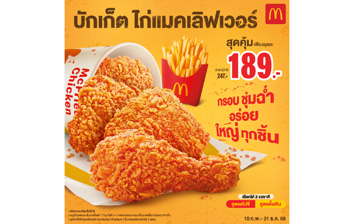 ท้าให้ลอง! ไก่ทอดแมค กรอบนอก เนื้อนุ่มชุ่มฉ่ำ อร่อย ขนาดใหญ่ทุกชิ้น ด้วย “บักเก็ตไก่แมคเลิฟเวอร์” คุ้มสุดๆ ในราคาเริ่มต้นเพียง 189 บาท ในชุดประกอบด้วย ไก่ทอดแมค 4 ชิ้น (สูตรสไปซี่หรือสูตรดั้งเดิม), เฟรนช์ฟรายส์ ขนาดกลาง 1 กล่อง พิเศษ! เพิ่มเพียง 39 บาท รับเครื่องดื่มขนาด 16 ออนซ์ จำนวน 2 แก้ว เลือกอร่อยจุใจคนเดียวหรือกับเพื่อนได้แล้วตั้งแต่วันนี้เป็นต้นไป ที่ร้านแมคโดนัลด์ทุกสาขาที่ร่วมรายการ, บริการ ไดร์ฟ ทรู (Drive Thru) และแมคดิลิเวอรีทั้ง 3 ช่องทาง โทร.1711, เว็บไซต์ www.mcdonalds.co.th และแอปพลิเคชันของแมคโดนัลด์ ดูรายละเอียดเพิ่มเติมได้ที่ Facebook.com/McThai