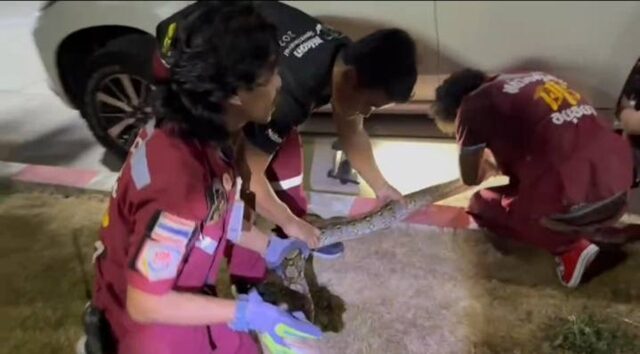ที่ถนนทางเข้าหมู่บ้านพบรถยนต์ ยี่ห้อมิตซูบิชิ ปาเจโร่ ทะเบียน 6-กฎ2897 กรุงเทพมหานคร จอดอยู่ เจ้าของรถชื่อ นายสุวัฒน์ (ขอสงวนนามสกุล) อายุ 64 ปี ยืนรอเจ้าหน้าที่กู้ภัยอยู่ พร้อมกับให้ข้อมูลชี้จุดที่งูเหลือมซุกซ่อนตัวอยู่ใต้ท้องรถ