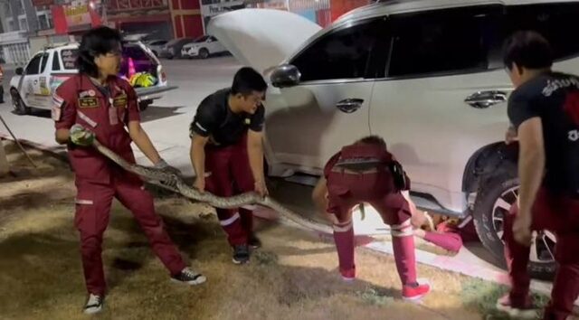 เจ้าหน้าที่ต้องมุดเข้าไปที่ใต้ท้องรถพบงูเหลือมขนาดใหญ่ขดตัวอยู่ตัวโครงรถ ใช้เวลาประมาณ 15 นาที งูเหลือมเริ่มคลายตัวและโผล่หัวออกมา จึงสามารถใช้มือช่วยกันดึงเอางูเหลือมออกมาจากใต้ท้องรถได้สำเร็จ