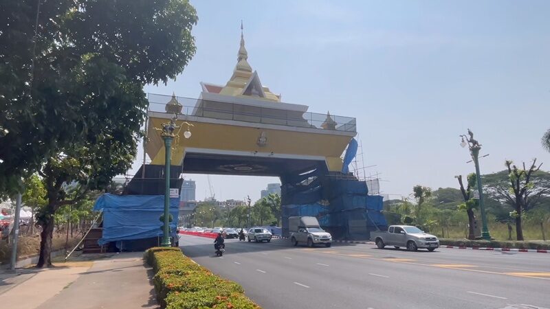 ซุ้มประตูเมืองขอนแก่น ที่กำลังทำการก่อสร้างซ่อมใหม่ จนเกิดดราม่าพระลับ
