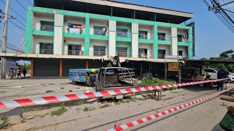 เกือบวินาศ รถชนอาคาร พ่วง 18 ล้อหลับใน หัวรถทะลุไปอีกห้อง แม่ค้าส้มตำล้มกองกับพื้น เจ็บรวม 2 คน ตร.กันเป็นพื้นที่อันตราย หวั่นถล่มลงมา คานกลางเกิดรอยร้าว
