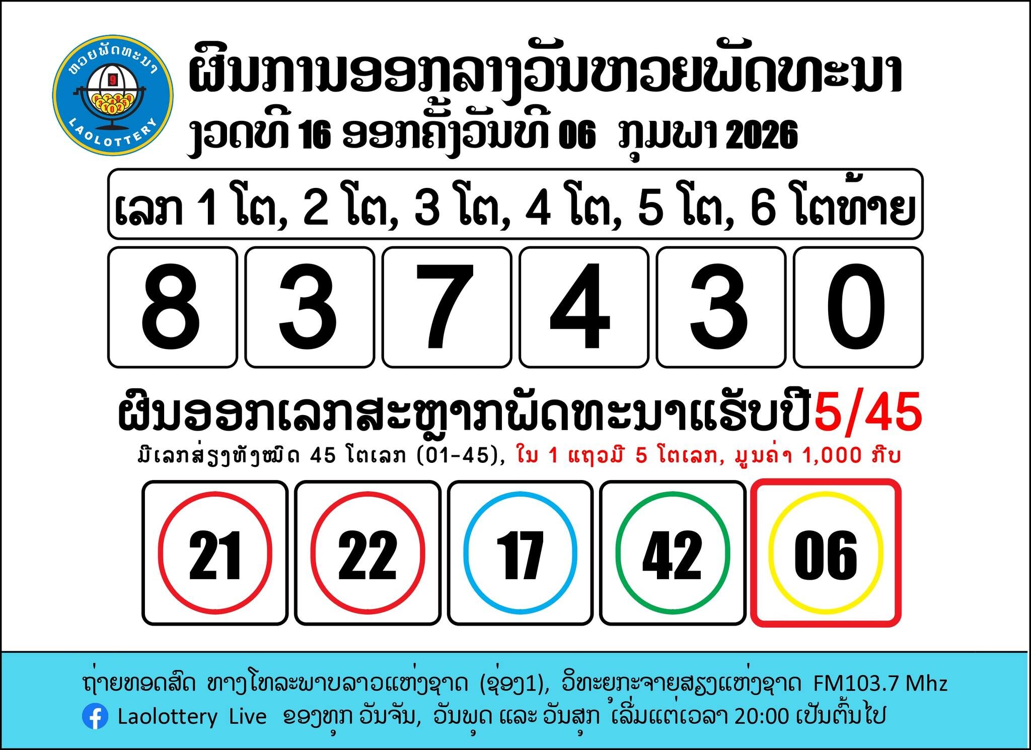 สรุปผลการออกรางวัลสลากกินแบ่งรัฐบาล สปป.ลาว หรือ หวยพัฒนา ภายใต้การกำกับของกระทรวงการเงิน งวดล่าสุดวันที่ 6 กุมภาพันธ์ 2569 ผลรางวัลทั้งหมดมีดังนี้: