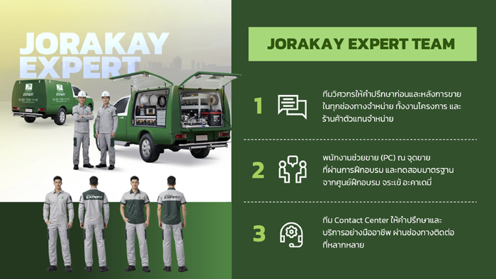 อีกหนึ่งไฮไลต์สำคัญของปีนี้ จระเข้ เปิดตัว JORAKAY EXPERT TEAM บริการดูแลงานก่อสร้างครบวงจรตั้งแต่ฐานรากถึงหลังคา โดยทีมวิศวกรผู้เชี่ยวชาญด้านวัสดุก่อสร้างที่ผ่านการฝึกอบรมมาตรฐานกว่า 100 คน มาให้คำปรึกษาและสนับสนุนทั้งช่าง ผู้รับเหมา พันธมิตรทางธุรกิจ และเจ้าของบ้าน ซึ่งเป็นการนำองค์ความรู้กว่า 3 ทศวรรษในวงการก่อสร้าง ดึงความเชี่ยวชาญ (Expertise) ใน 6 มิติ มาปั้นเป็นบริการให้พันธมิตรและลูกค้า ได้แก่ 1. PRODUCT ในฐานะผู้เชี่ยวชาญด้านการวิจัยและพัฒนาผลิตภัณฑ์ที่ได้รับการรับรองระดับประเทศและสากล พร้อมสร้างมาตรฐานให้วงการก่อสร้างอยู่เสมอ 2. INNOVATION จระเข้ โดดเด่นด้วยการผสานเทคโนโลยีที่ช่วยยกระดับผลิตภัณฑ์เพื่อสร้างคุณค่าและผลกระทบเชิงบวกแก่สังคม อาทิ เทคโนโลยีระดับโลก “Microban” เพื่อยับยั้งราดำ, Dustless Technology กาวซีเมนต์ลดการฟุ้งกระจายของฝุ่นได้ถึง 80% และ JORAKAY Road Fix Express ปูนผสมสำเร็จสำหรับซ่อมพื้นผิวถนนคอนกรีตชนิดบาง เซตตัวเร็วพร้อมเปิดพื้นที่หลังซ่อมได้ภายใน 6 ชั่วโมง 3. INTERNATIONAL ในฐานะผู้นำนวัตกรรมก่อสร้างที่ประสบความสำเร็จในการขยายธุรกิจสู่ตลาดต่างประเทศได้อย่างมั่นคง 4. CHANNEL ความเชี่ยวชาญด้านช่องทางจัดจำหน่ายสินค้าที่หลากหลายตอบโจทย์ลูกค้า ทั้งโมเดิร์นเทรด, JORAKAY SHOP และช่องทางออนไลน์ 5. ACADEMY ศูนย์ฝึกอบรมและศูนย์ทดสอบมาตรฐานฝีมือแรงงาน จระเข้ อะคาเดมี่ (JORAKAY Academy Training Center) การถ่ายทอดความเชี่ยวชาญสู่พัฒนาศักยภาพของบุคลากรในวงการก่อสร้าง และ 6. CONTACT CENTER จระเข้ ให้ความสำคัญกับการรับฟังความคิดเห็นของลูกค้าผ่านทุกช่องทางการติดต่อเพื่อนำมาปรับปรุงและต่อยอดเป็นบริการใหม่ๆ ที่อำนวยความสะดวกให้ลูกค้าอย่างต่อเนื่อง ให้งานก่อสร้างออกมาสมบูรณ์ถูกต้องและได้มาตรฐาน โดยสำหรับโครงการขนาดใหญ่ จระเข้มีทีมวิศวกรสนับสนุนก่อนและหลังการขาย