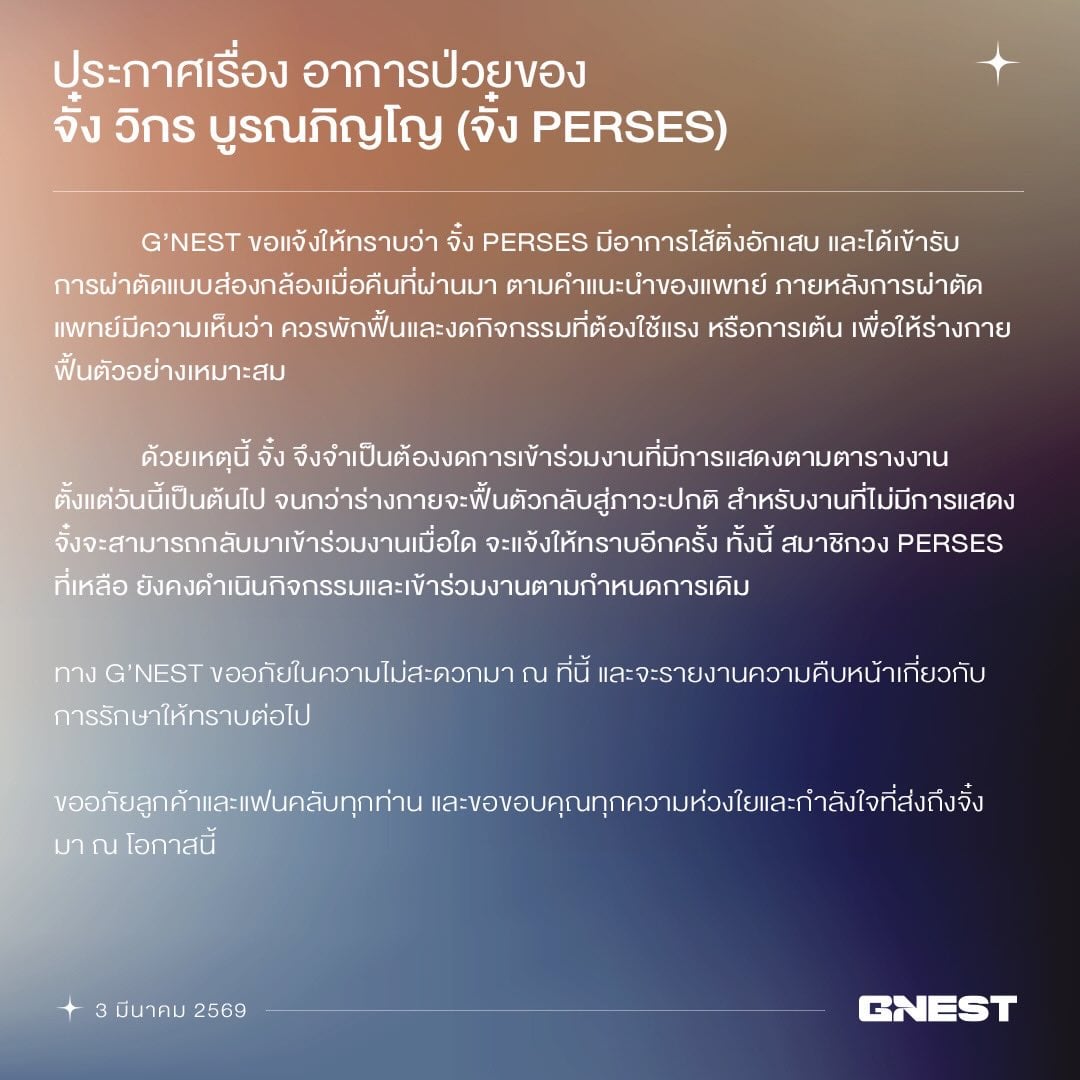 “ประกาศเรื่อง อาการป่วยของ “จั๋ง วิกร บูรณภิญโญ” (จั๋ง PERSES) G'NEST ขอแจ้งให้ทราบว่า จั๋ง PERSES มีอาการไส้ติ่งอักเสบ และได้เข้ารับการผ่าตัดแบบส่องกล้องเมื่อคืนที่ผ่านมา ตามคำแนะนำของแพทย์ ภายหลังการผ่าตัดแพทย์มีความเห็นว่า ควรพักฟื้นและงดกิจกรรมที่ต้องใช้แรง หรือการเต้น เพื่อให้ร่างกายฟื้นตัวอย่างเหมาะสม