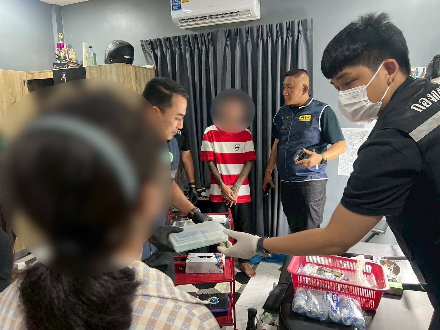ในข้อหา “ประกอบวิชาชีพเวชกรรมโดยไม่ได้ขึ้นทะเบียนและไม่ได้รับอนุญาต” และ “ประกอบกิจการสถานพยาบาลโดยไม่ได้รับอนุญาต” พร้อมตรวจยึดของกลาง อาทิ เม็ดมุกแก้วลักษณะกลมคละขนาด จำนวน 683 เม็ด, ฟิลเลอร์ยี่ห้อ Neuramis Volume Lidocaine 5 กล่อง, น้ำเกลือล้างแผล, ใบมีดผ่าตัด 136 อัน, กระบอกฉีดยา, เข็มเย็บแผล และอุปกรณ์ที่เกี่ยวข้อง รวมกว่า 977 ชิ้น