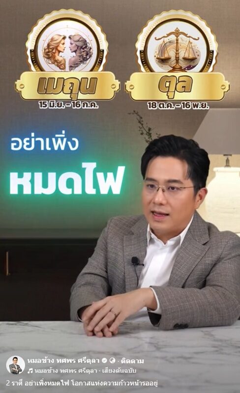 ดวงชะตาเดือนนี้ กำลังจะเข้าสู่ช่วงโค้งสุดท้ายของเดือน หมอช้าง ทศพร โพสต์คลิปให้กำลังใจ “2 ราศี อย่าเพิ่งหมดไฟ โอกาสแห่งความก้าวหน้ารออยู่” โดย 2 ราศี ได้แก่