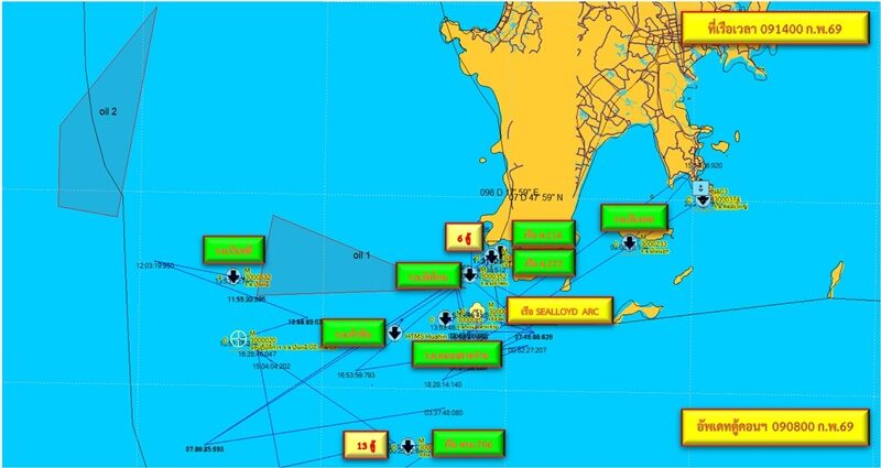 วันที่ 9 ก.พ.69 พล.ร.ท.วีรุดม ม่วงจีน ผู้อำนวยการ ศรชล.ภาค 3/ผู้บัญชาการเหตุการณ์ เป็นประธานการประชุมติดตามสถานการณ์ ร่วมกับรองอธิบดีกรมเจ้าท่า และหน่วยงานที่เกี่ยวข้อง เพื่อประเมินสถานการณ์และกำหนดแผนปฏิบัติการ หลังเรือ SEALLOYD ARC จมลงใต้น้ำโดยสมบูรณ์และมีการเคลื่อนตัวจากพิกัดเดิม กองทัพเรือมอบหมายให้ ร.ล.หนองสาหร่าย เป็นหน่วยบัญชาการในพื้นที่ (On Scene Commander) ทำการค้นหาซากเรือด้วยโซนาร์
