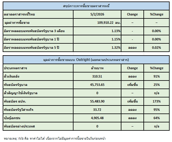 สมาคมตลาดตราสารหนี้ไทย(ThaiBMA) สรุปภาวะตลาดตราสารหนี้ไทยประจำวันนี้ มีมูลค่าการซื้อขายรวมทั้งวันอยู่ที่ 109,910 ล้านบาท ด้านประเภทของนักลงทุน ที่มีมูลค่าการซื้อขายสูงที่สุด 2 อันดับแรก คือ 1. กลุ่มบริษัทหลักทรัพย์จัดการกองทุน (บลจ.) ซื้อสุทธิ 19,203 ล้านบาท 2. กลุ่มบริษัทประกัน ขายสุทธิ 847 ล้านบาท ในขณะที่นักลงทุนต่างชาติ ขายสุทธิ 2,038 ล้านบาท Yield พันธบัตรอายุ 5 ปี ปิดที่ 1.32% ปรับตัวลดลงจากเมื่อวาน -0.02%