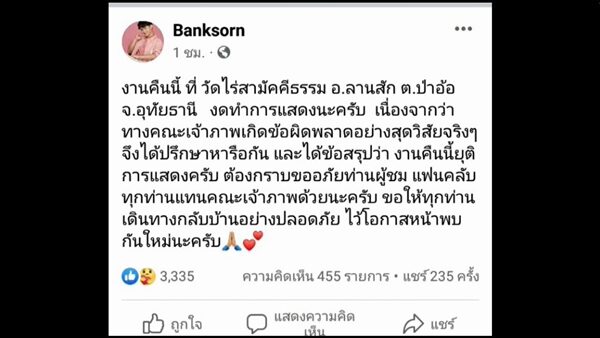 ขณะที่เพจของคณะลิเกศรราม น้ำเพชร โพสต์ว่า "งานคืนนี้ที่วัดไร่สามัคคีธรรม อ.ลานสัก ต.ป่าอ้อ จ.อุทัยธานี งดทำการแสดงนะครับ เนื่องจากว่าทางคณะเจ้าภาพเกิดข้อผิดพลาดอย่างสุดวิสัยจริง ๆ จึงได้ปรึกษาหารือกัน และได้ข้อสรุปว่างานคืนนี้ยุติการแสดงครับ ต้องกราบขออภัยท่านผู้ชม แฟนคลับทุกท่านแทนคณะเจ้าภาพด้วยนะครับ ขอให้ทุกท่านเดินทางกลับบ้านอย่างปลอดภัยไว้โอกาสหน้าพบกันใหม่นะครับ"