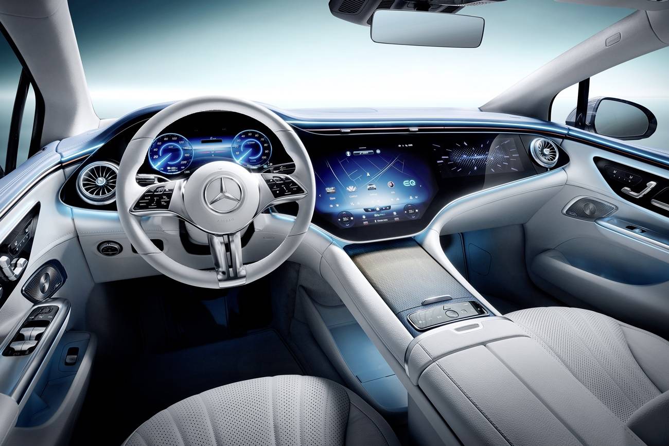 ยกงานดีไซน์มาจาก EQS และ EQE SUV มาผสมผสานกันตั้งแต่ แผงคอนโซลหน้าดีไซน์เอกลักษณ์พาดเต็มด้วยจอสัมผัสทั้งแผงแบบ MBUX Hyperscreen 3 จอรวม 56 นิ้วแยกการทำงาน ประกอบด้วยจอข้อมูลการขับขี่กับมาตรวัด 12.3 นิ้ว, หน้าจอกลาง Infotainment 17.7 นิ้ว, หน้าจอสำหรับผู้โดยสารตอนหน้า 12.3 นิ้ว จอสัมผัสรองรับความบันเทิงหลากรูปแบบรวมถึงอัปเดตระบบต่างๆแบบ OTA ได้ ลำโพงคุณภาพจาก Burmester รอบคันแบบ 360 องศาด้วยระบบ Dolby Atmos