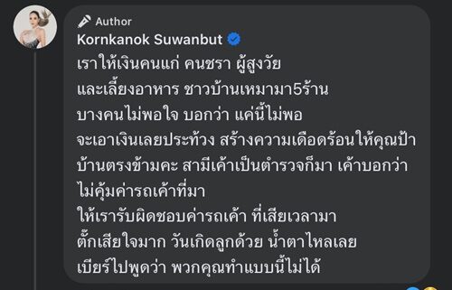 ทาง "ตั๊ก" จึงให้ทีมงานไปเคลียร์ พร้อมกับอธิบายว่า"ตัวเธอเองนั้นโพสต์บอกบุญ แค่เฉพาะคนในซอยรามอินทรา 65 ไม่ได้บอกให้ใครเดินทางมาจากต่างจังหวัด เพื่อมารับของแจก ส่วนตัวทำบุญมาเพิ่งเคยเจอ ให้ทีมงานเอาตำรวจมา เพราะตนเองแจกเงิน และแจกอาหารเสร็จหมดแล้ว