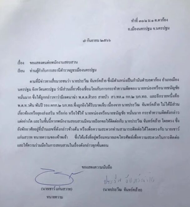 ตามที่มีข่าวว่า ตนที่มีตำแหน่งเป็นกำนัน ต.ตาก้อง อ.เมืองนครปฐม มีส่วนเกี่ยวข้องกับการกระทำผิดของนายหน่อง ซึ่งถูกกล่าวหาว่ามีเจตนาฆ่าพ.ต.ต.ศิวกร ยืนยันกำนันนกไม่ได้มีส่วนเกี่ยวข้องหรือยุยงส่งเสริม หรือก่อ หรือใช้ให้นายหน่อง กระทำความผิดดังกล่าว พร้อมลงชื่อกำนันนกและทนายความ ลงวันที่ 7 ก.ย.2566