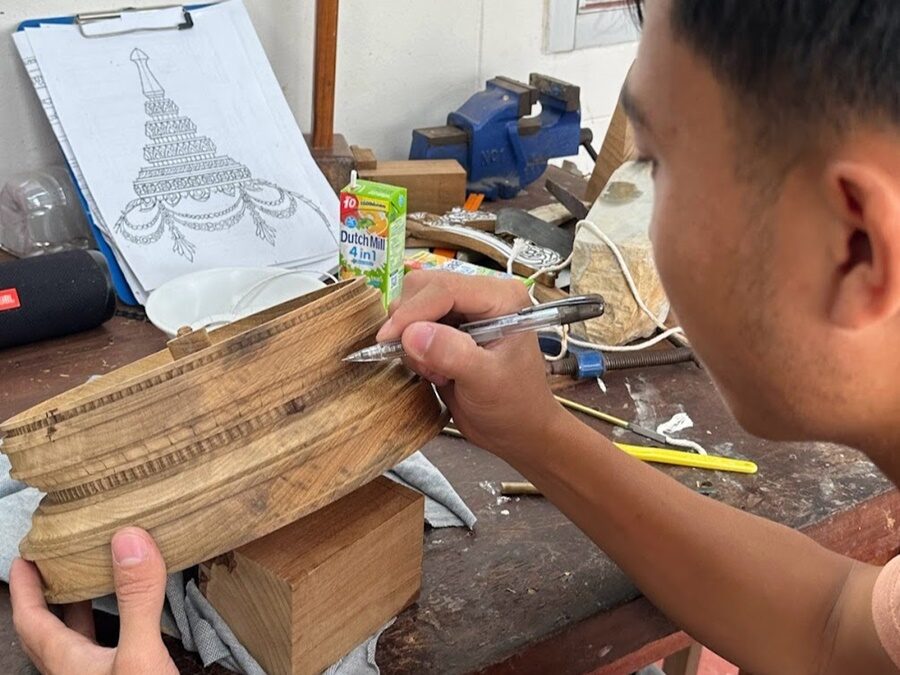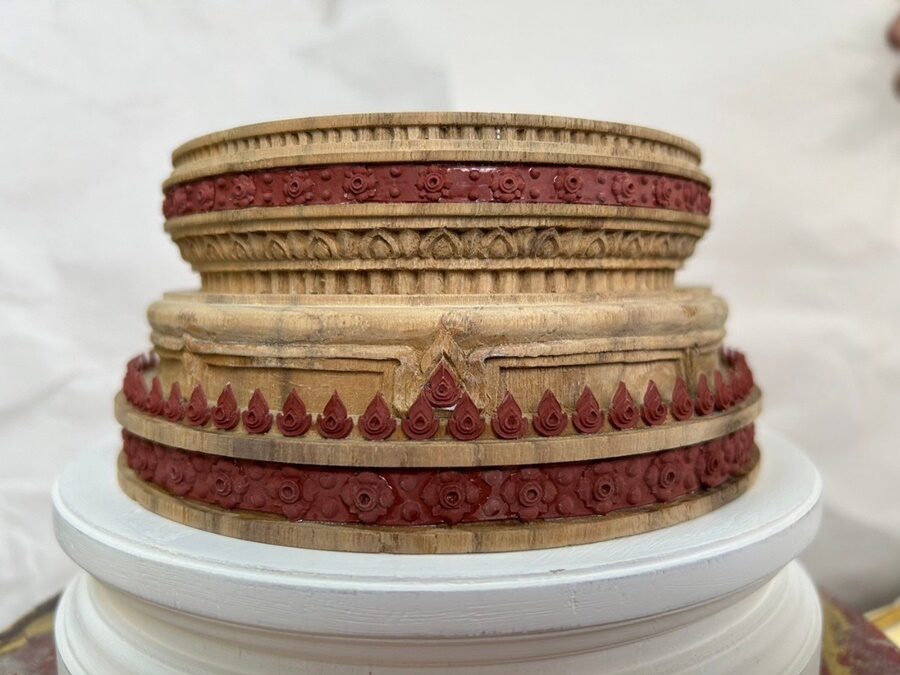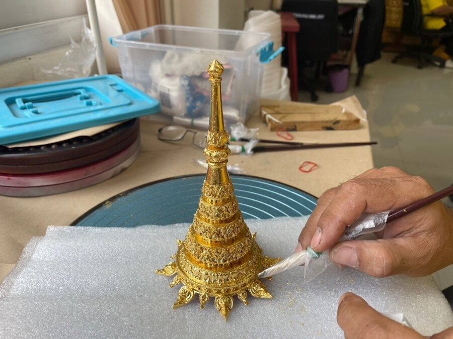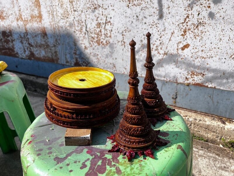 กลุ่มงานช่างแกะสลักและช่างไม้ประณีต ดำเนินการขึ้นหุ่นส่วนยอดและส่วนฐานด้วยกระบวนการกลึงไม้ ไม้ที่ใช้สร้างพระเจดีย์เป็นไม้สัก แกะสลักลวดลายในส่วนยอดและส่วนฐานของพระเจดีย์ทั้ง 3 องค์