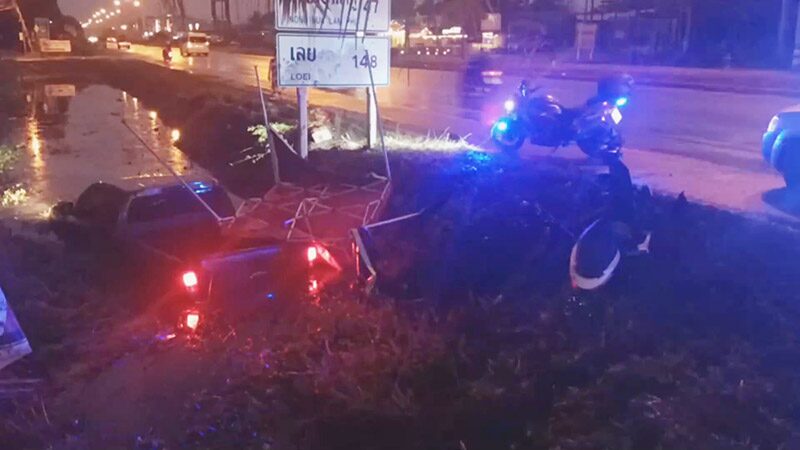 หนุ่มขับกระบะฝ่าฝน ถนนลื่นเสียหลัก ชนจยย.ไรเดอร์คอหักดับสลด เสยซาเล้งจอดข้างทางอีกคัน ก่อนพุ่งตกคลอง ยันไม่ได้ตั้งใจ