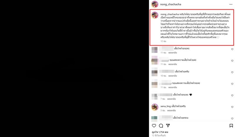 ท่ามกลาง คอมเมนต์จากแฟนๆ และชาวเน็ตเข้ามาร่วมแสดงความเสียใจด้วยจำนวนมาก พร้อมทั้งให้กำลังใจตลกดัง โหน่ง ชะชะช่า ด้วย