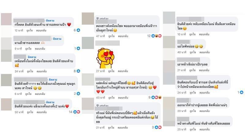 หลังโพสต์ดังกล่าวเผยแพร่ไป มีแฟนๆ เข้ามาแสดงความยินดีกันอย่างมากมาย อาทิ เหมือนทั้งโมเน่ทั้งน้องโซลเลย ยินดีด้วยนะค้าบ, ยินดีด้วยจ้า แข็งแรงทั้งแม่และลูกจ้า, ผสมมาทั้งเจ่เจ้และเฮียเลย, ตอนซาวด์เหมือนโซล พอออกมาเหมือนพี่เน่จ้า เอ็นดูสาโรจน์, จะโดนซารอสตกอีกคนไหมเนี่ย หลังจากโดนพี่โซลกับพี่โมเน่ตกมาแล้ว,