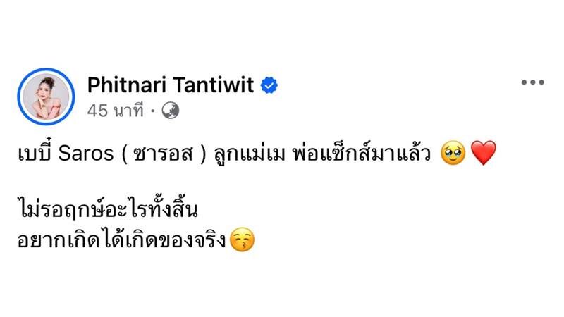 โดยแม่เม ได้โพสต์ภาพกับลูกน้อย โดยมีสามีเคียงข้าง พร้อมเขียนข้อความกำกับว่า “เบบี๋ Saros (ซารอส) ลูกแม่เม พ่อแซ็กส์มาแล้ว ไม่รอฤกษ์อะไรทั้งสิ้น อยากเกิดได้เกิดของจริง” ก่อนจะเปิดภาพ น้องซารอส ให้เห็นแบบชัดๆ เพิ่มเติมในคอมเมนต์