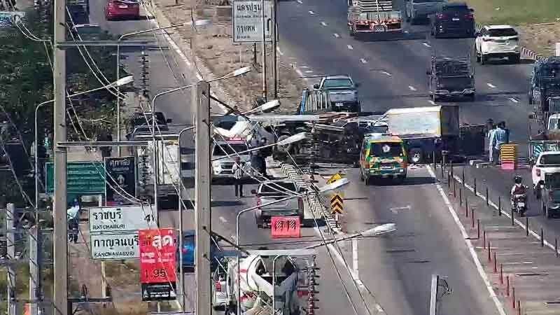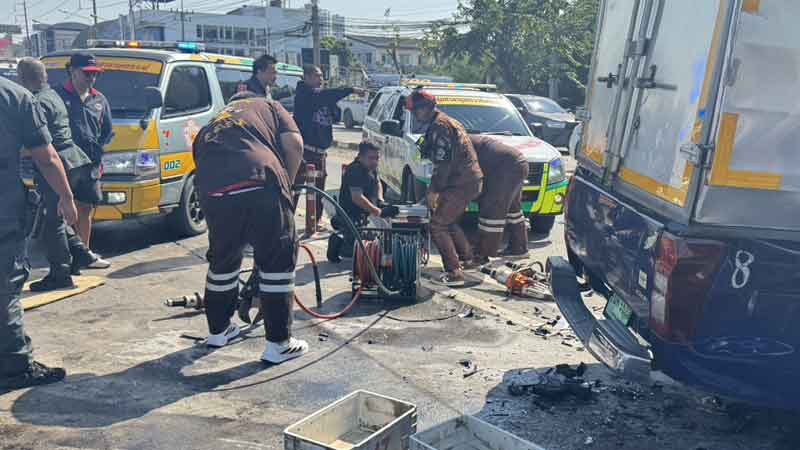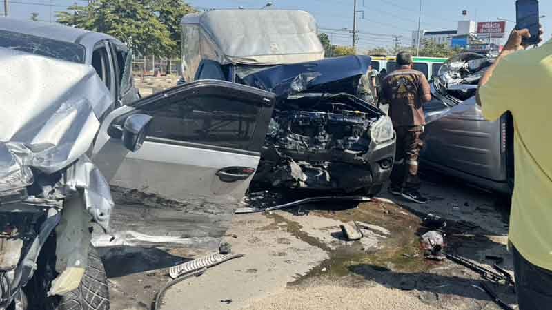 รถพ่วง พุ่งข้ามเลน ชนกระบะเลนสวน 3 คัน พังยับ ชายวัย59-ร.ต.อ.วัย59 เสียชีวิตสลด