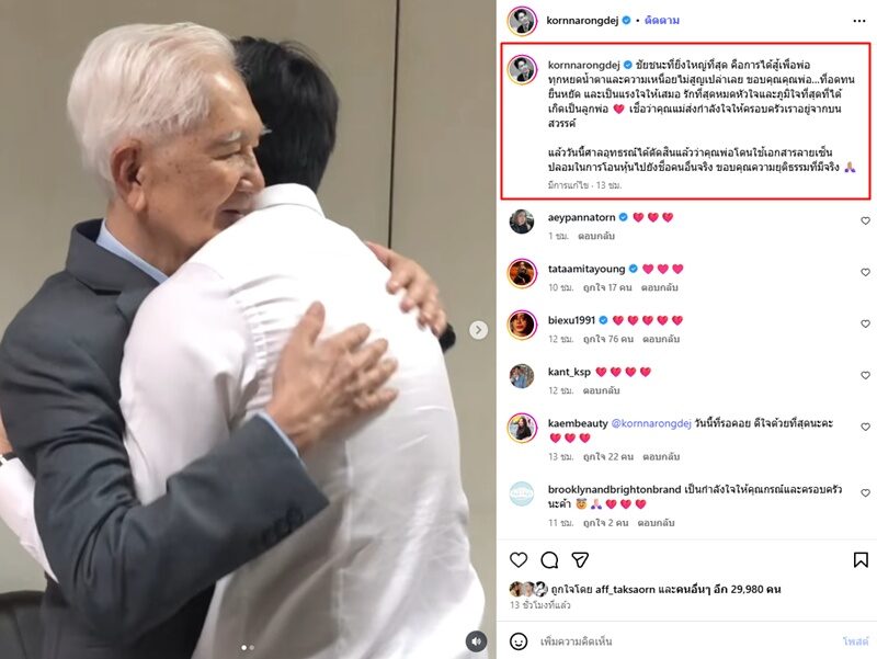 ทุกหยดน้ำตาและความเหนื่อยไม่สูญเปล่า กรณ์ ณรงค์เดช สามีนางเอกดังกอดคุณพ่อเกษมดีใจชัยชนะยิ่งใหญ่ที่สุดคือสู้เพื่อพ่อหลังศาลพิพากษาคืนความเป็นธรรม คนดังคนบันเทิงแห่ส่งกำลังใจ