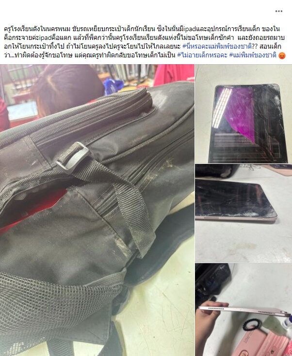 แม่โพสต์เดือด ไม่อายเด็กเหรอ ครูโรงเรียนดังนครพนม ขับรถเหยียบกระเป๋าลูก ไอแพดพัง ซ้ำพีกไม่ขอโทษสักคำ เศร้าเพิ่งซื้อให้ลูก