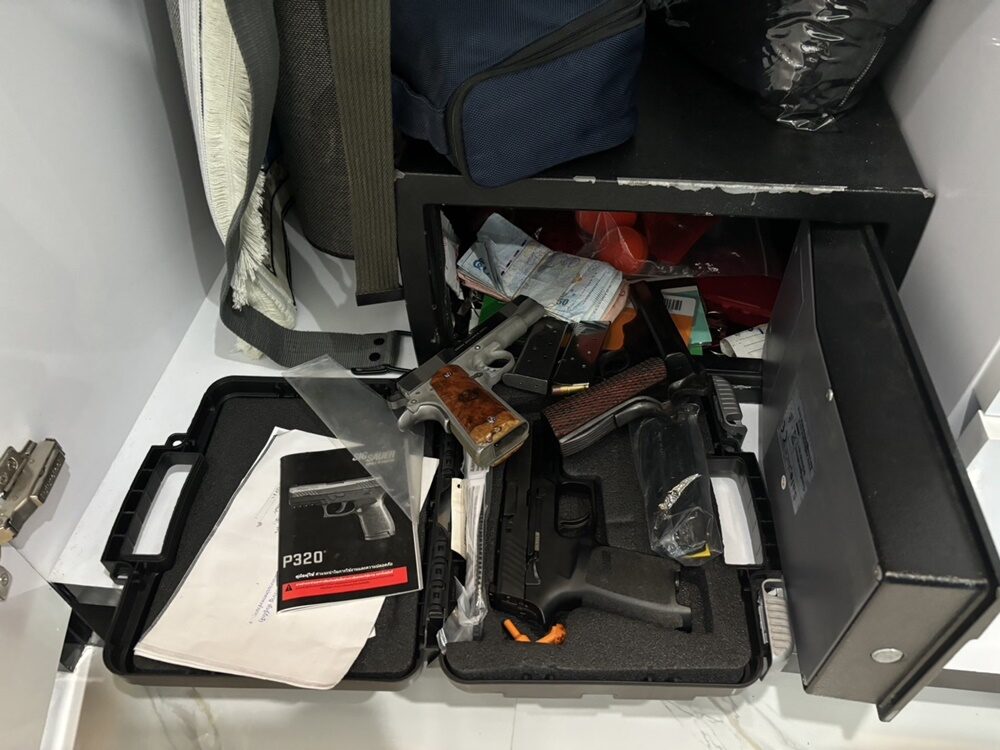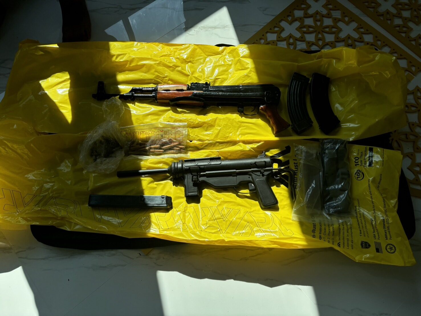อาวุธปืนกลมือทอมสัน แบบ M3 ใช้กระสุน 11 ม.ม. ไม่มีทะเบียน 1 กระบอก อาวุธปืนพกสั้นกึ่งอัตโนมัติ ขนาด 11 ม.ม. มีร่องรอยลบเลขทะเบียน 1 กระบอก อาวุธปืนพกสั้นกึ่งอัตโนมัติ ขนาด 9 ม.ม. 1 กระบอก อาวุธปืนพกสั้น ลูกซองหักลำไทยประดิษฐ์ ใช้กระสุน เบอร์12 ไม่มีทะเบียน 1 กระบอก กระสุนปืนรวม 500 นัด แม็กกาซีน 6 อันและใบ ป.4 ปลอม 2 ใบ