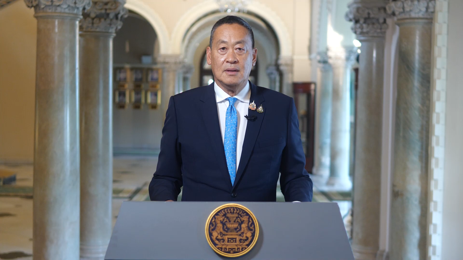 นายเศรษฐา ทวีสิน นายกรัฐมนตรี กล่าวถ้อยแถลงต่อที่ประชุมคณะกรรมการมรดกโลกสมัยสามัญ ครั้งที่ 46 ผ่านระบบวิดีทัศน์ ภายหลังคณะกรรมการมรดกโลกฯ มีมติให้ขึ้นทะเบียนอุทยานประวัติศาสตร์ภูพระบาทเป็นมรดกโลก