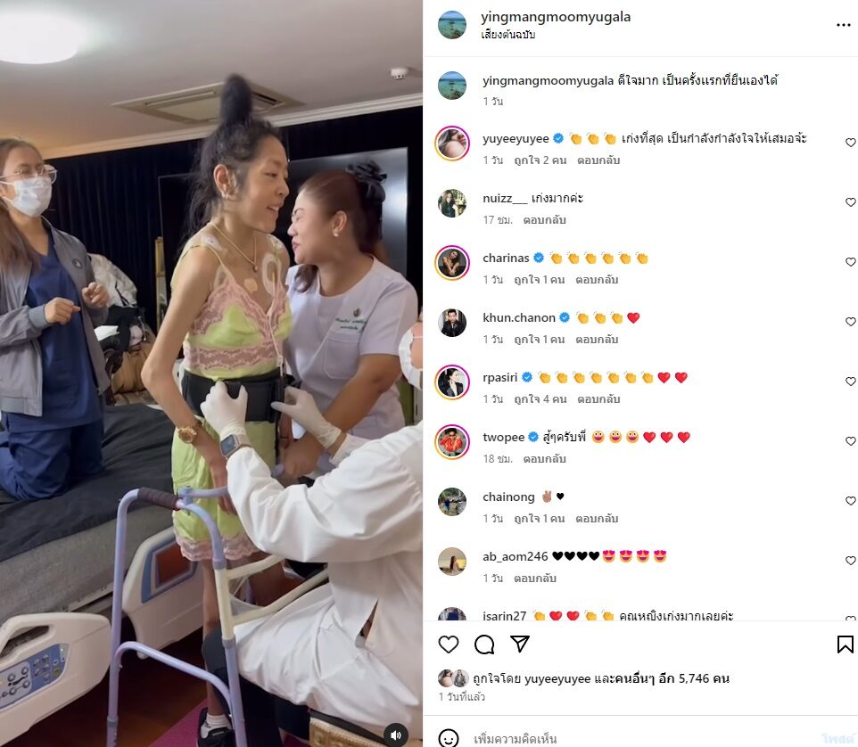 ขณะที่ คุณหญิงแมงมุม กำลังฝึกยืนและยืนได้เองเป็นครั้งแรกนานถึง 5 นาทีด้วย โดยคนบันเทิงเข้ามาคอมเมนต์ปรบมือรัวๆ พร้อมส่งหัวใจกำลังใจล้นหลาม แห่ชม