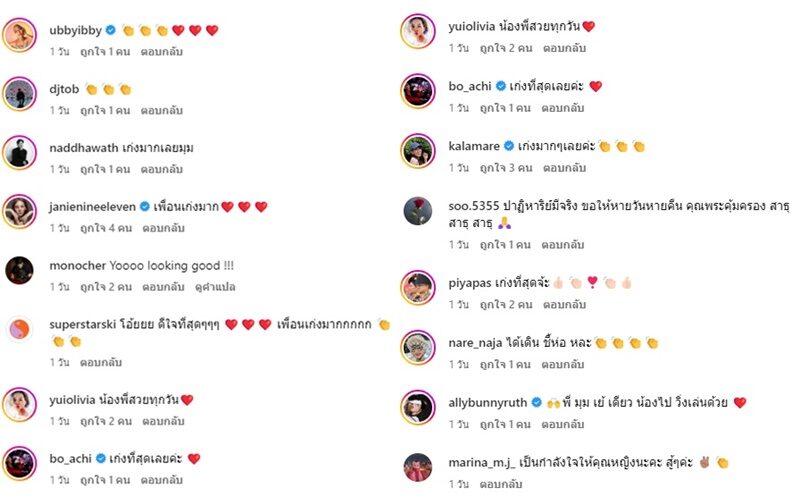 เจนี่ เทียนโพธิ์สุวรรณ์ ก็เข้ามาคอมเมนต์ให้กำลังใจด้วยว่า “เพื่อนเก่งมาก” , โบ ชญาดา ก็ชมด้วยว่า