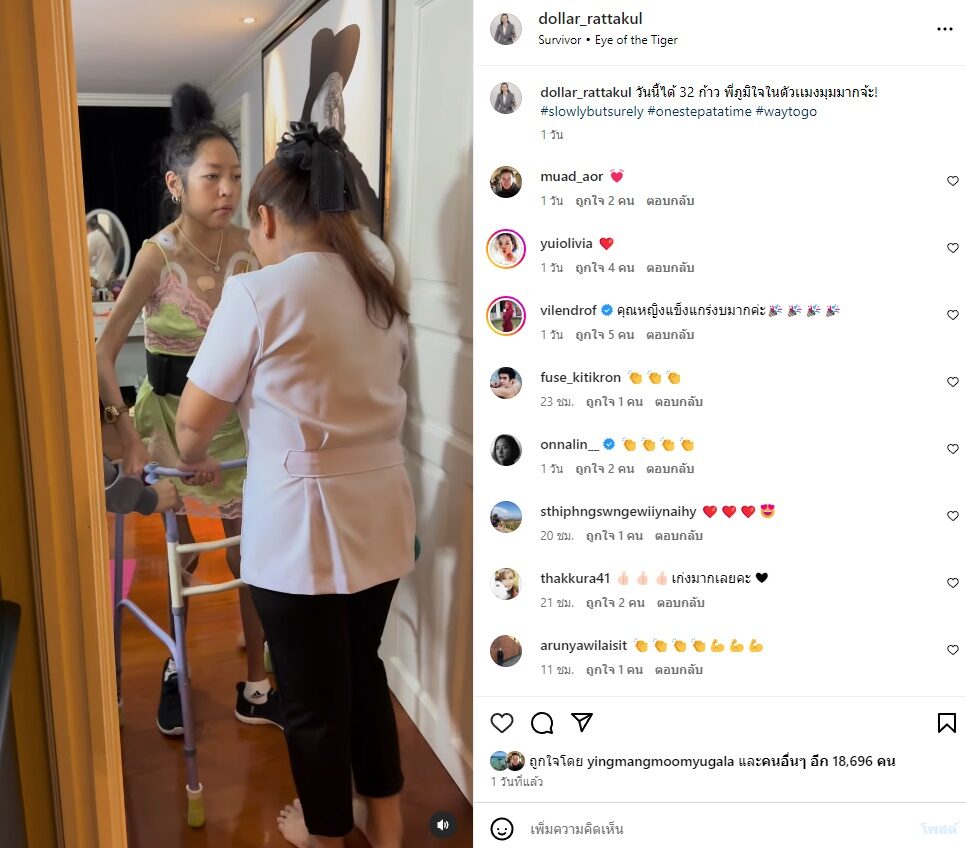 ด้าน เสธ.ดอลลาร์ สามีก็สุดดีใจคอยให้กำลังใจตลอดอยู่ข้างๆ พร้อมทั้งยังได้โพสต์คลิป(ชมคลิป) ภรรยาเดินได้หลายสิบก้าวแล้วสุดภูมิใจ