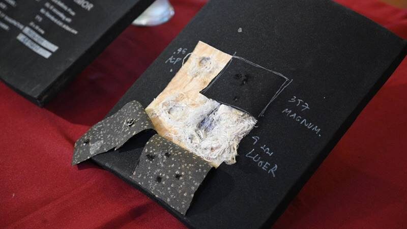 โดยในระหว่างการแถลงข่าว เจ้าหน้าที่ได้เปิดคลิปวิดีโอยิงทดสอบเสื้อเกราะระบุหมายเลขซีเรียลนัมเบอร์ 8A154338 ซึ่งเป็นตัวเดียวกับที่ปรากฏในภาพดังกล่าวให้รับชมด้วยอาวุธปืนพก 3 แบบ ประกอบด้วยกระสุนขนาด 9 มม., ขนาด .357 แม็กนั่ม และขนาด .45 อย่างละ 3 นัด พร้อมอธิบายถึงวัสดุและเส้นใยที่ใช้ผลิตเสื้อเกราะตัวดังกล่าว