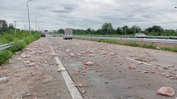 อ่านข่าวต้นฉบับได้ที่ : ไก่สดกระจายเกลื่อนถนน รถส่งไก่ ยางระเบิด พุ่งตกถนนทางด่วน M6