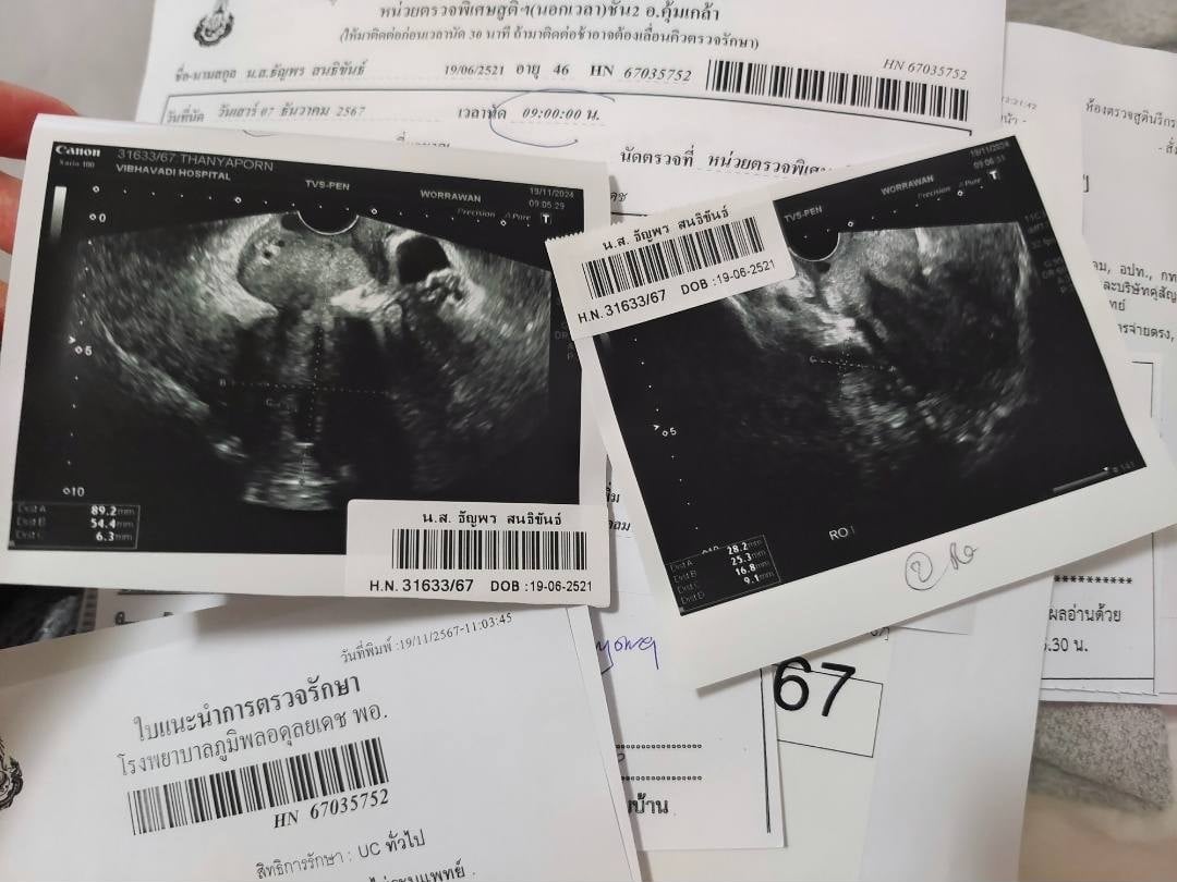 19 พฤศจิกายน ตัดสินใจไปหาหมอตรวจภายใน หมออัลตร้าซาวด์พบก้อนเนื้อขนาด 4–5 เซนติเมตร อยู่ในมดลูก แต่ใกล้กับปากมดลูกจนห้อยลงมา หลังจากนั้นจอยต้องไปหาหมอหลายครั้ง หมอใช้เวลาวินิจฉัยนาน และก็ต้องกินยา Tranexamic Acid หลายร้อยเม็ดเพื่อพยายามหยุดเลือด ระหว่างนั้น ชีวิตการทำงานก็ยังคงเดินหน้าต่อไป ช่วงนั้นต้องใส่แพมเพิสผู้ใหญ่เพื่อไปถ่ายไพลอตซีรีส์ ไปเป็น MC ที่เขาใหญ่ และถ่ายละครกับพี่วุธ ทั้งๆ ที่เจ็บท้องมาก แต่เพราะรักงาน จึงเลือกอดทน และ ไม่ยอมบอกใคร สุดท้ายหลังตรวจชิ้นเนื้อถึง 2 ครั้ง จึงยืนยันได้ว่าเป็นมะเร็ง คุณหมอสูติส่งต่อไปที่แผนกมะเร็งนรีเวช พร้อมทำ CT Scan เพื่อตรวจการลุกลาม