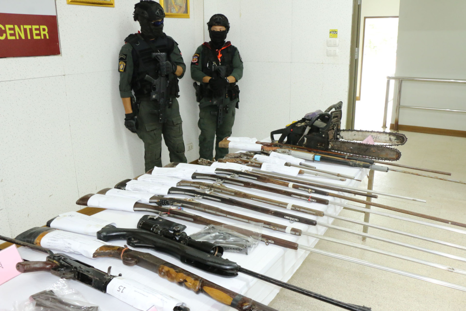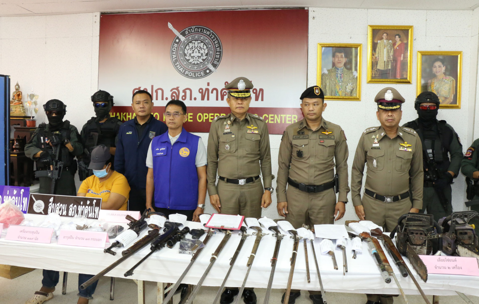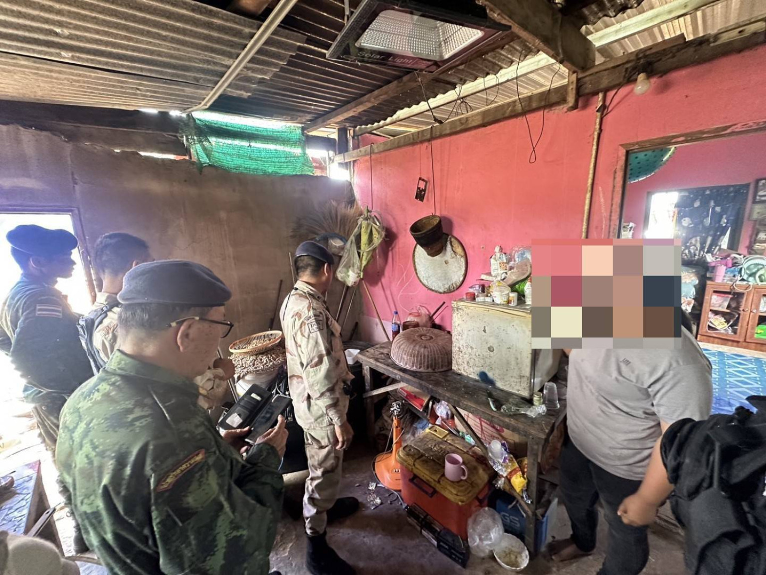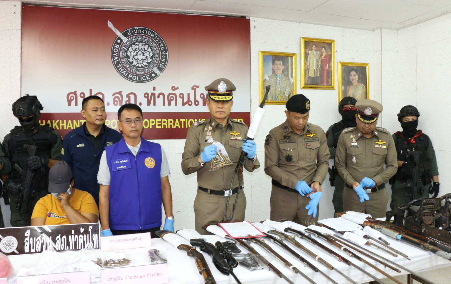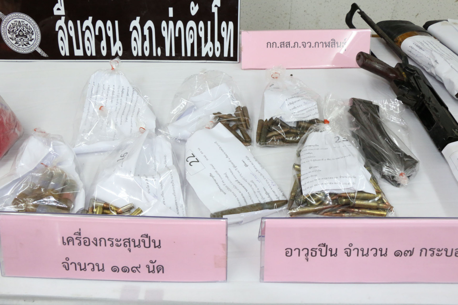 โดยผลการตรวจสอบพบว่า บ้านหลังดังกล่าวเป็นบ้านของนายสดใส หรือเม้า (สงวนนามสกุล) อายุ 38 ปี ซึ่งมีพฤติกรรม จำหน่ายยาเสพติด และเมื่อไปถึงพบ น.ส.กาญจนา หรือกบ (สงวนนามสกุล) อายุ 39 ปี ภรรยา อยู่ในบ้าน ขณะที่นายสดใสหลบหนีไปได้ ผลการตรวจค้น พบยาบ้า จำนวน 1,551 เม็ด และยาบ้าเปียกน้ำ จำนวน 1,386 กรัม นอกจากนี้เจ้าหน้าที่ยังได้พบอาวุธปืนเอเค 47 จำนวน 1 กระบอก พร้อมแม็กกาซีน บรรจุกระสุน จำนวน 22 นัด ปืนลูกซองยาว จำนวน 1 กระบอก ปืนสั้นขนาด 9 มม. พร้อมซองกระสุนปืนจำนวน 1 กระบอก ปืนแก๊ปยาว จำนวน 8 กระบอก ปืนแก๊ปสั้น จำนวน 3 กระบอก ปืนอัดลม จำนวน 3 กระบอก รวมอาวุธปืนจำนวน 17 กระบอก รวมทั้งเครื่องกระสุนปืนขนาด 7.62 มม. จำนวน 36 นัด กระสุนขนาด M60 จำนวน 56 นัด กระสุนขนาด .50 BMG จำนวน 1 นัด กระสุนขนาด 0.30 มม. จำนวน 1 นัด กระสุนขนาด 9 มม. 17 นัด ลูกซองเบอร์ 12 จำนวน 8 นัด รวมกระสุนปืน จำนวน 119 นัด และเลื่อยโซ่ยนต์ จำนวน 2 เครื่อง จึงตรวจยึดไว้เป็นหลักฐาน และนำตัวน.ส.กาญจนา มาสอบปากคำที่โรงพัก