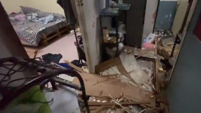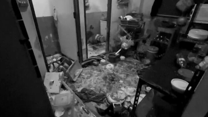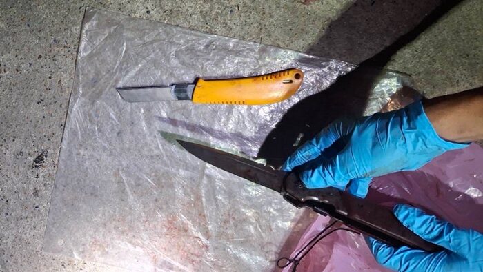 จากการตรวจสอบภายในห้องมีสิ่งของถ้วยจานหม้อข้าวกระจาย มีคราบเลือดเต็มพื้นห้อง และยังพบอาวุธมีดแบบพับ และมีดคัตเตอร์ รวม 2 เล่มตกอยู่ เจ้าหน้าที่จึงเก็บไว้เป็นหลักฐาน