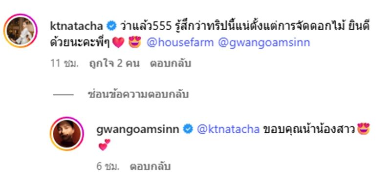 ขณะที่มีคอมเมนต์ด้วย “ว่าแล้ว555 รู้สึกว่าทริปนี้แน่ตั้งแต่การจัดดอกไม้ ยินดีด้วยนะคะพี่ๆ@housefarm @gwangoamsinn” ซึ่ง กวาง ก็เข้ามาตอบด้วยว่า “ขอบคุณน้าน้องสาว”