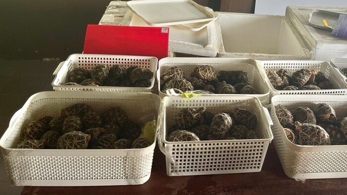 ภายในบรรจุเต่าดาวอินเดีย (Indian Star TortoiseX) จำนวน 191 ตัว และปลามังกร ลักษณะคล้ายกับปลาอะโรวาน่าแดง บรรจุภายในถุงพลาสติก จำนวน 4 ถุง รวมปลาทั้งหมด 12 ตัว