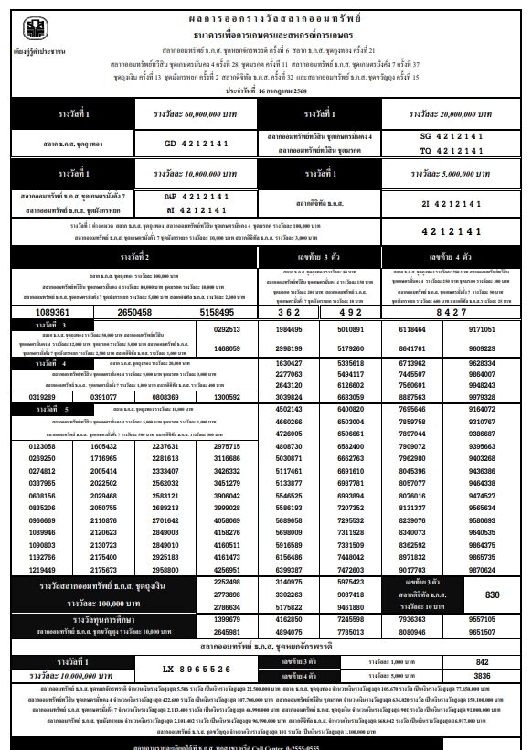 วันที่ 16 ก.ค.2568 ผลการออกรางวัลสลากออมทรัพย์ ธนาคารเพื่อการเกษตรและสหกรณ์การเกษตร ระบุว่า