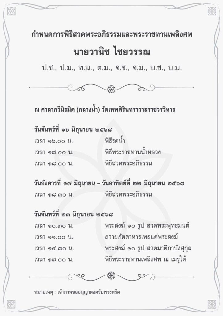 พิธีรดน้ำศพกำหนดจัดในวันที่ 16 มิถุนายน 2568 เวลา 16:00 น. ส่วนพิธีสวดพระอภิธรรมจะมีขึ้นระหว่างวันที่ 17–22 มิถุนายน 2568 เวลา 18:30 น. และพิธีพระราชทานเพลิงศพจะจัดขึ้นในวันที่ 23 มิถุนายน 2568 เวลา 17:00 น.