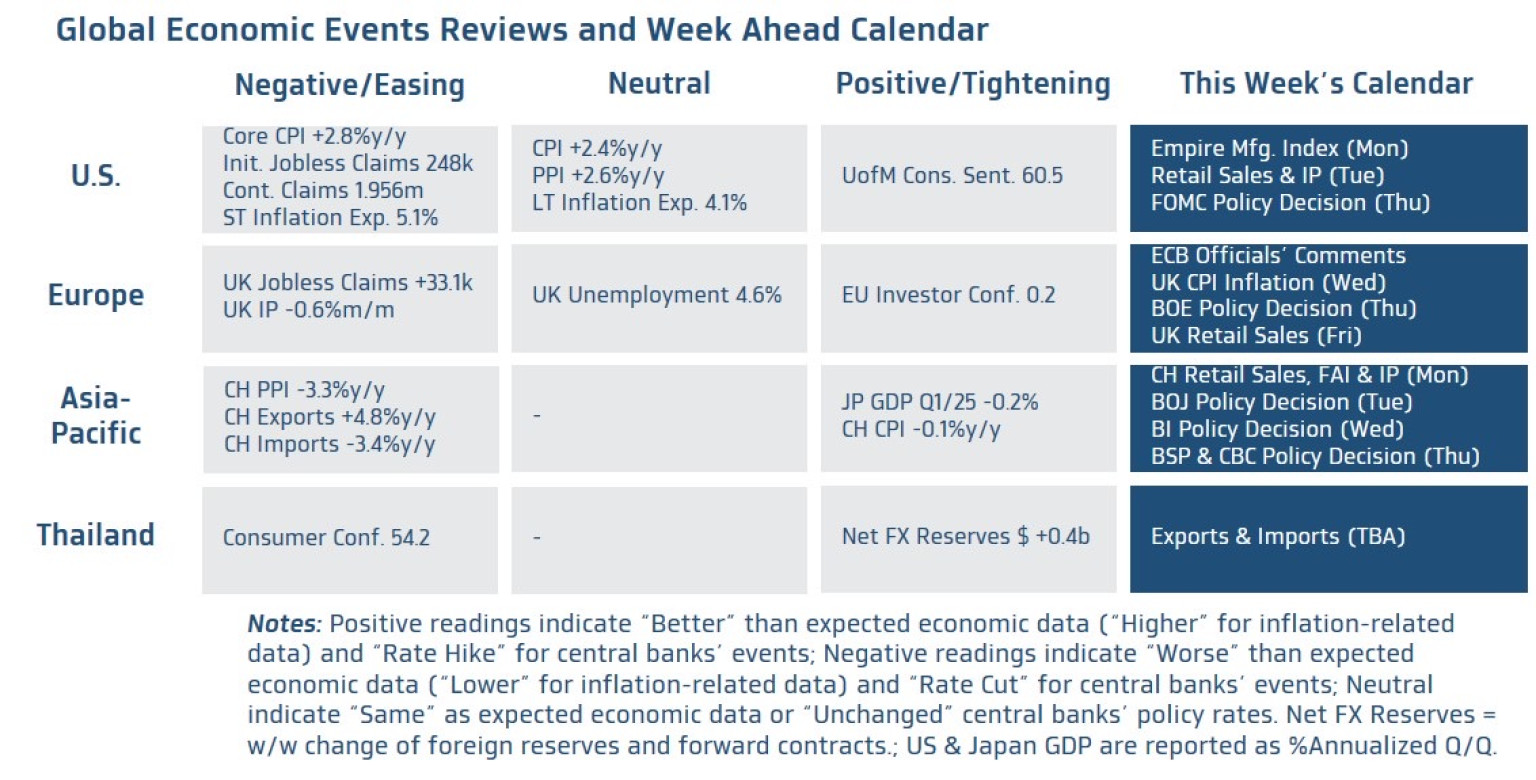 ▪ ฝั่งสหรัฐฯ – ไฮไลท์สำคัญจะอยู่ที่ ผลการประชุม FOMC ของเฟด เดือนมิถุนายน ที่จะรับรู้ในช่วงราว 01.00 น. เช้าวันที่ 19 มิถุนายน นี้ ตามเวลาประเทศไทย โดยเรามองว่า FOMC จะยังคงอัตราดอกเบี้ยนโยบายไว้ที่ระดับ 4.25-4.50% ตามเดิม จนกว่าจะมั่นใจในแนวโน้มเงินเฟ้อ ท่ามกลางความไม่แน่นอนของทั้งนโยบายการค้าของสหรัฐฯ และความเสี่ยงภูมิรัฐศาสตร์ อย่าง ความขัดแย้งในตะวันออกกลางที่ทวีความรุนแรงมากขึ้น ทั้งนี้ เราขอแนะนำว่า ควรจับตาการปรับคาดการณ์เศรษฐกิจ และอัตราดอกเบี้ย (Dot Plot) อย่างใกล้ชิด เนื่องจากล่าสุด บรรดาผู้เล่นในตลาดต่างมองว่า FOMC อาจเดินหน้าลดดอกเบี้ยได้ราว 2 ครั้ง ในปีนี้ และอีกราว 2-3 ครั้ง ในปีหน้า ซึ่งดูใกล้เคียงกับ Dot Plot เดือนมีนาคม ทำให้ หาก Dot Plot ใหม่ มีการเปลี่ยนแปลง เช่น บรรดาเจ้าหน้าที่เฟดส่วนใหญ่มองว่า เฟดอาจลดดอกเบี้ยเพียง 1 ครั้ง ก็อาจส่งผลกระทบต่อตลาดการเงินได้พอสมควร นอกเหนือจากประเด็นในข้างต้น ผู้เล่นในตลาดจะรอติดตามพัฒนาการของการเจรจาการค้าระหว่างสหรัฐฯ กับบรรดาประเทศคู่ค้า และปัจจัยเสี่ยงด้านภูมิรัฐศาสตร์ อย่าง การโจมตีระหว่างอิสราเอลกับอิหร่านที่จะยิ่งทวีความร้อนแรงของปัญหาความขัดแย้งในตะวันออกกลาง ซึ่งอาจส่งผลกระทบต่อตลาดการเงินได้อย่างมีนัยสำคัญในระยะสั้น โดยเฉพาะราคาน้ำมันดิบ ในส่วนของรายงานข้อมูลเศรษฐกิจนั้น ผู้เล่นในตลาดจะรอลุ้น รายงานยอดค้าปลีก (Retail Sales) เดือนพฤษภาคม และดัชนีภาคการผลิตโดยเฟด สาขานิวยอร์ก (Empire Manufacturing Index)