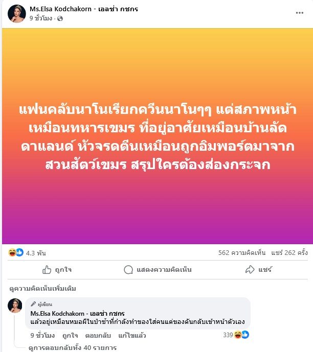 เอลซ่า กชกร มิสแกรนด์หนองบัวลำภู ปี2023 ซัดกลับ นาโน มิสแกรนด์กัมพูชา ปี2023 ควรสำนึกเกิดที่ไทย แฉนก2หัว ฟาดเดือดว่าหญิงไทยขายบริการ ลั่นหน้าหนูไม่ควรไปเหยียดใครนะ